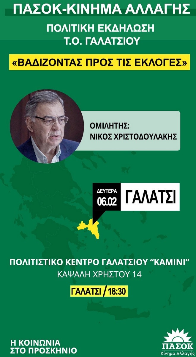 Ο Νίκος Χριστοδουλάκης θα μιλήσει σε εκδήλωση που διοργανώνει η Τ.Ο. ΠΑΣΟΚ-ΚΙΝΗΜΑ ΑΛΛΑΓΗΣ Γαλατσίου, στο Πολιτιστικό Κέντρο του Δήμου Γαλατσίου «Καμίνι» (Χρήστου Καψάλη 14), με θέμα: «Βαδίζοντας προς τις εκλογές», τη Δευτέρα 6 Φεβρουαρίου 2022, στις 18:30.
