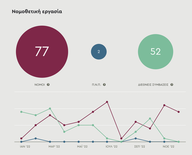 Δείτε τα στατιστικά γραφήματα και τις οπτικοποιήσεις της νομοθετικής παραγωγής και του κοινοβουλευτικού ελέγχου για την τελευταία ημερολογιακή χρονιά της ΙΗ’ περιόδου, εδώ.