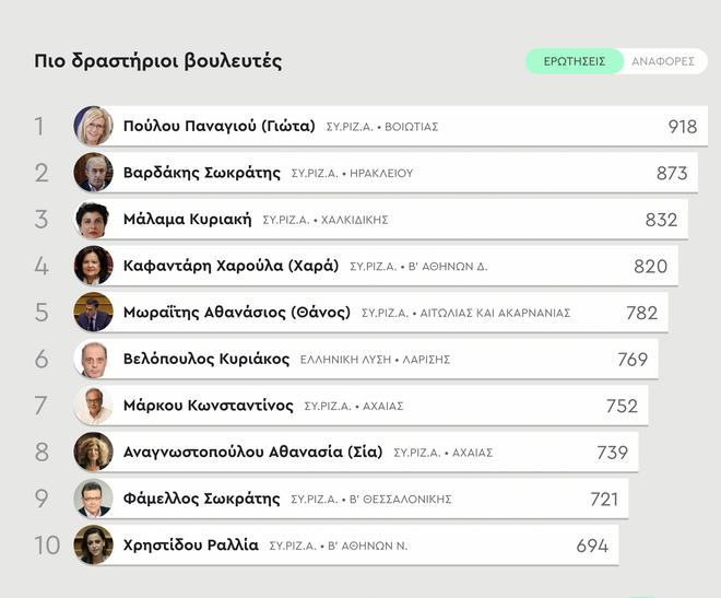 Πιο δραστήριοι βουλευτές Vouliwatch