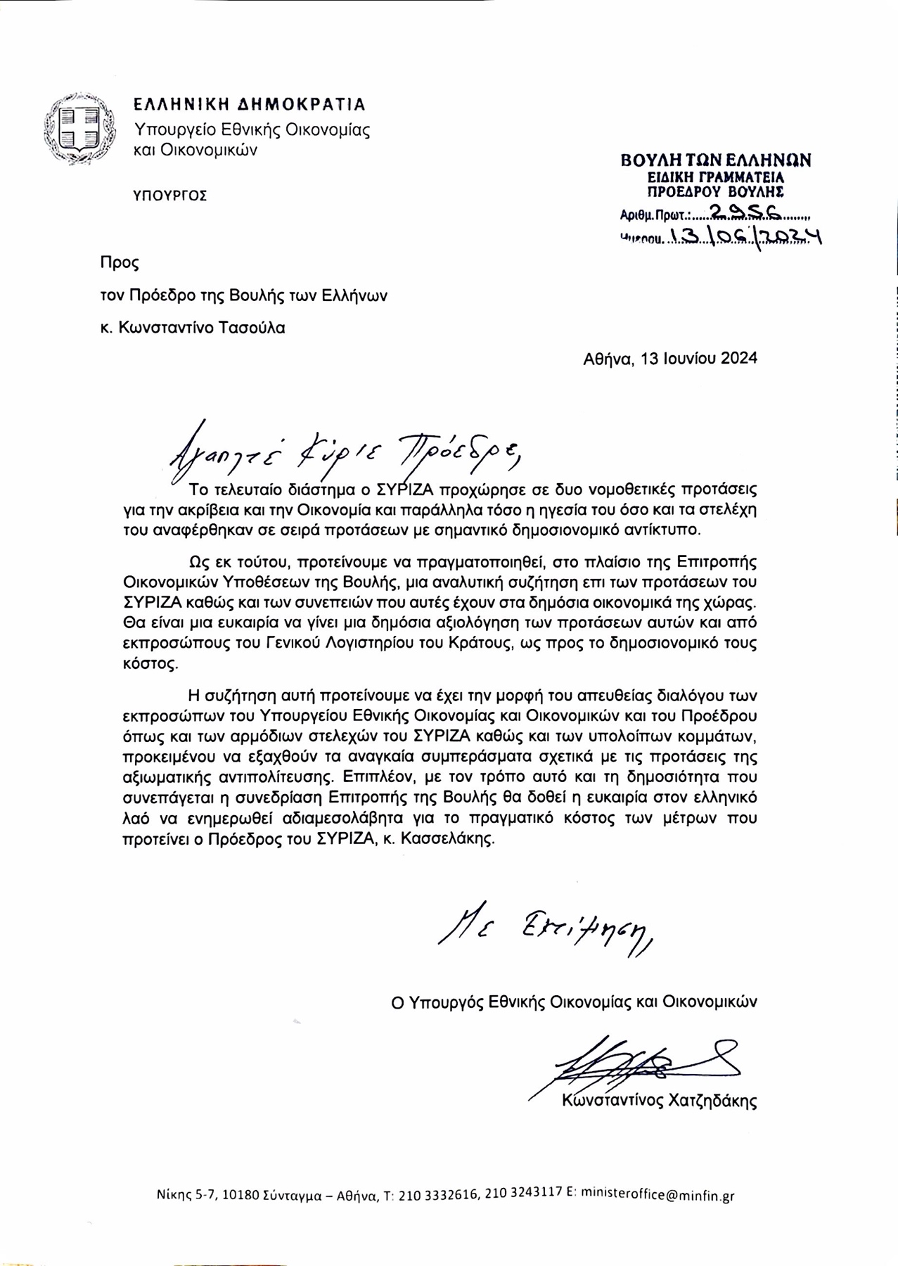 Επιστολή με την οποία ζητά να συνεδριάσει η Επιτροπή Οικονομικών της Βουλής προκειμένου να συζητηθεί το κόστος των προτάσεων που έχει καταθέσει ο ΣΥΡΙΖΑ για την οικονομία απέστειλε ο ΥΠΟΙΚ Κωστής Χατζηδάκης στον Πρόεδρο της Βουλής Κώστα Τασούλα.