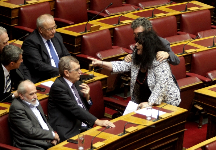 Μάταια προσπαθούσε η αντιπρόεδρος της Βουλής να την ηρεμήσει, ώστε να σταματήσει να φωνάζει και να συνεχίσει την τοποθέτησή του ο κ. Βενιζέλος.