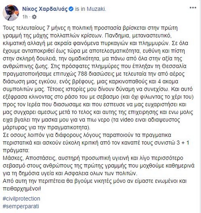 Η απάντηση του Νίκου Χαρδαλιά στο facebook