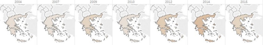Δείτε το χάρτη παρακάτω. Σημειώστε πως στο ποσοστό της Ελλάδας, η έρευνα αθροίζει ΛΑΟΣ, Χρυσή Αυγή, Εθνικό Μέτωπο και Ένωση για την Πατρίδα και το Λαό. Επιλέξτε κάθε χρονιά από το μενού πάνω δεξιά στο χάρτη.