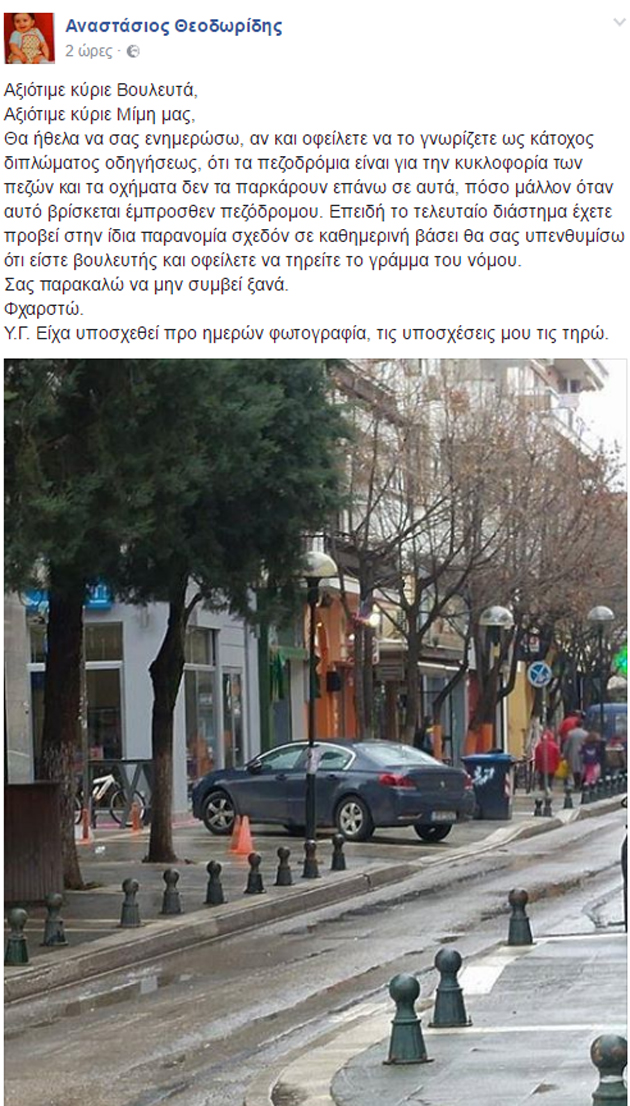 “Το τελευταίο διάστημα έχετε προβεί στην ίδια παρανομία σχεδόν σε καθημερινή βάσει θα σας υπενθυμίσω ότι είστε βουλευτής και οφείλετε να τηρείτε το γράμμα του νόμου” σχολιάζει ο κ. Θεοδωρίδης, ιατροδικαστής στο επάγγελμα (κατά το προφίλ του), από το λογαριασμό του στο facebook όπου ανάρτησε τη φωτογραφία.