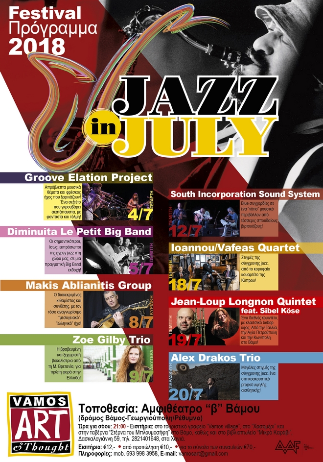 Ο Βάμος Χανίων εδραιώνεται ως ο απόλυτος Jazz προορισμός, καθώς το 7ο Jazz in July Festival φιλοξενεί φέτος μερικά από τα κορυφαία ονόματα της ελληνικής και διεθνούς μουσικής σκηνής