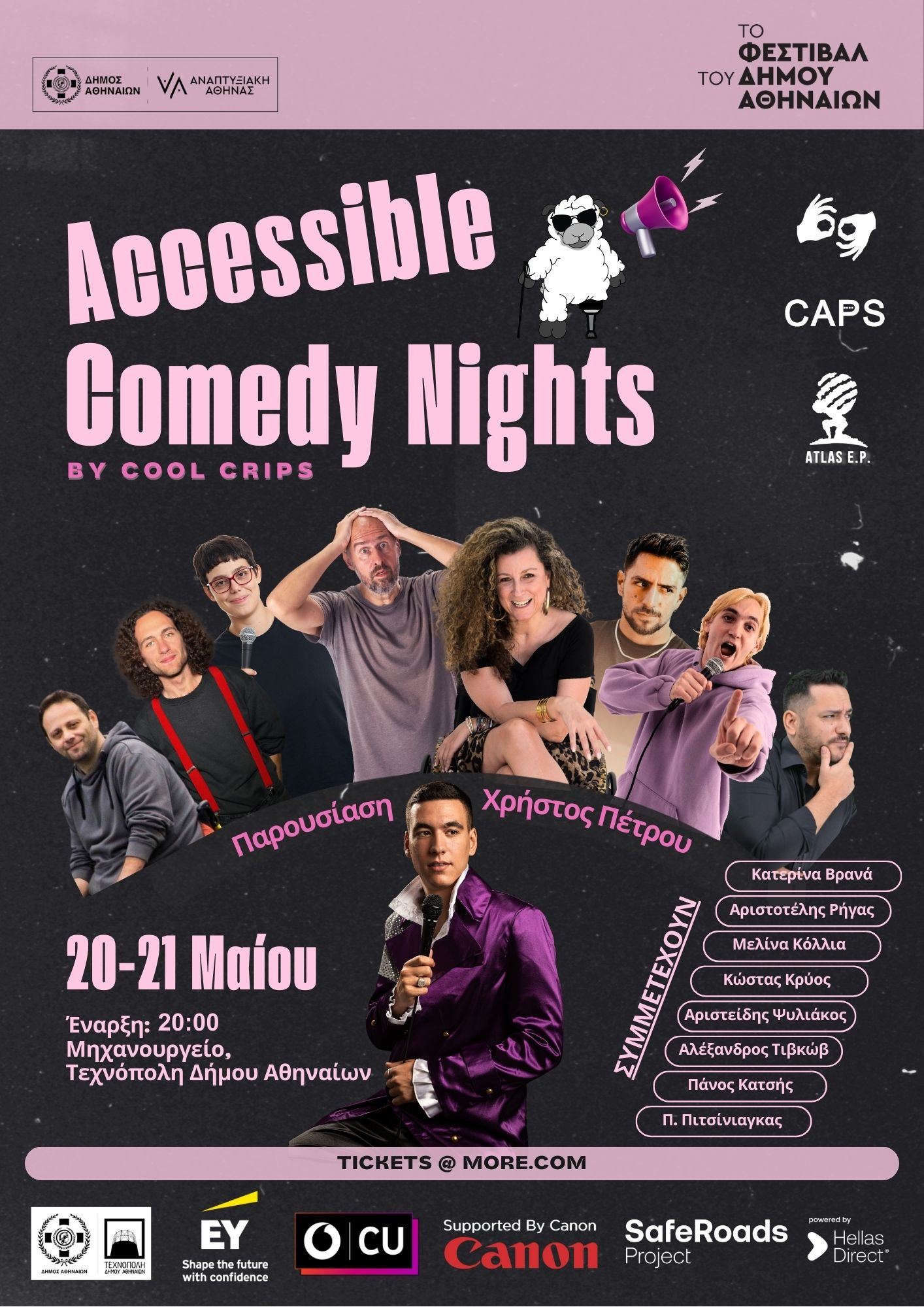 Η εκδήλωση θα πραγματοποιηθεί σε χώρο προσβάσιμο σε άτομα με κινητικές βλάβες και θα περιλαμβάνει ζωντανή διερμηνεία στην Ελληνική Νοηματική Γλώσσα, καθώς και ζωντανό υπερτιτλισμό στα ελληνικά από την Atlas E.P. Οι κωμικές εμφανίσεις θα είναι επίσης σχεδιασμένες ώστε να είναι φιλικές προς τυφλά άτομα.