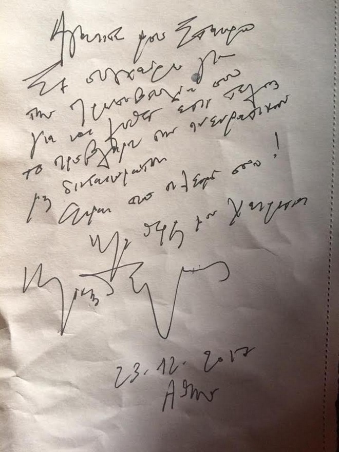 Ένα ιδιαίτερης σημασίας ιδιόχειρο σημείωμά του στον αληθινό εμπνευστή και πρωτοστάτη της πρωτοβουλίας μας, τον ΣΤΑΥΡΟ ΞΑΡΧΑΚΟ.