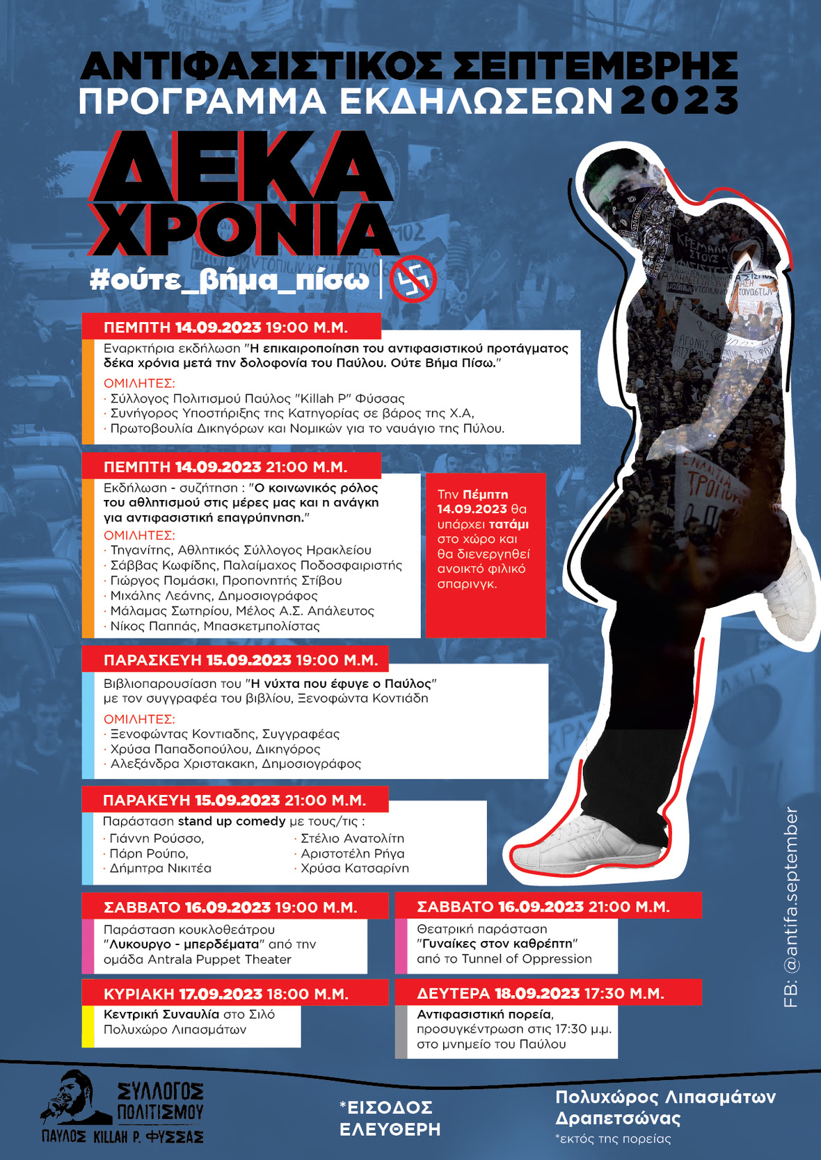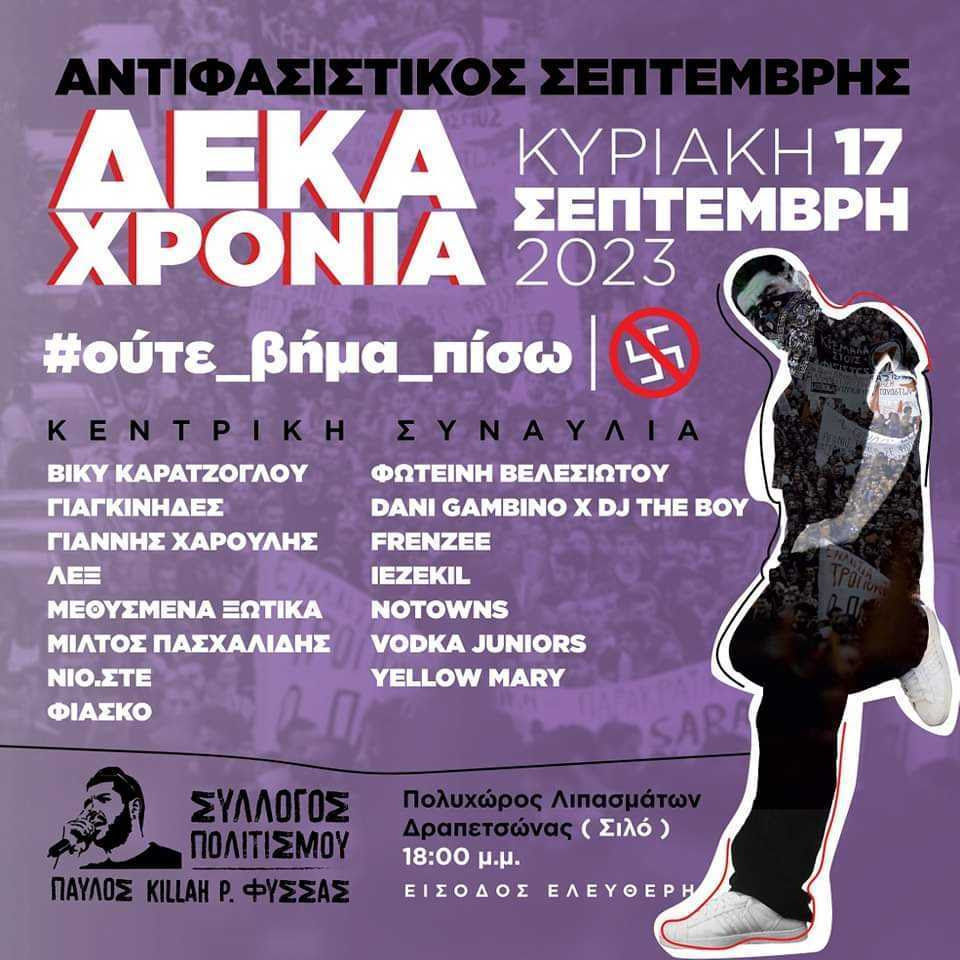 Δέκα χρόνια μετά δεν έχουμε ξεχάσει και δεν υπάρχει καμία περίπτωση να αφήσουμε το παρόν και το μέλλον μας στους φασίστες. Καμία ανοχή σε οποιοδήποτε ψήγμα φασιστικού λόγου και έργου. Δε θα περάσει ο φασισμός! Οι εκδηλώσεις του Σεπτέμβρη, από την πορεία και τη συναυλία μέχρι τις πολιτικές ομιλίες και τα πολιτισμικά δρώμενα, συνιστούν τις ανησυχίες μας, τις χαρές μας, τις αμφιβολίες μας, τις αντιφάσεις μας, τις δράσεις και τις σκέψεις μας, συνιστούν τη ζωή μας ενάντια στο κίνημα του θανάτου.