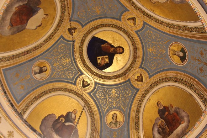 Ο ναός κτίστηκε σύμφωνα με σχέδια του αρχιτέκτονα Αναστασίου Μεταξά -και όχι του Τσίλλερ όπως αποδίδονταν μέχρι πρόσφατα- και εγκαινιάστηκε στις 26 Μαρτίου 1895, παρουσία υψηλών προσκεκλημένων. Η εξωτερική επιφάνειά του διαμορφώνεται πλαστικά, με οριζόντιες παράλληλες ταινίες που διαχωρίζονται με σκοτίες και στην ανώτερη στάθμη διαμορφώνεται ζώνη με έκτυπα κυκλικά στοιχεία. Τα ανοίγματα του ναού πλαισιώνουν παραστάδες με γύψινα επίκρανα κορινθιακού τύπου, ενώ τα δύο αντιδιαμετρικά παράθυρα φέρουν αξιόλογες υαλογραφίες (βιτρώ), ρωσικού εργαστηρίου.