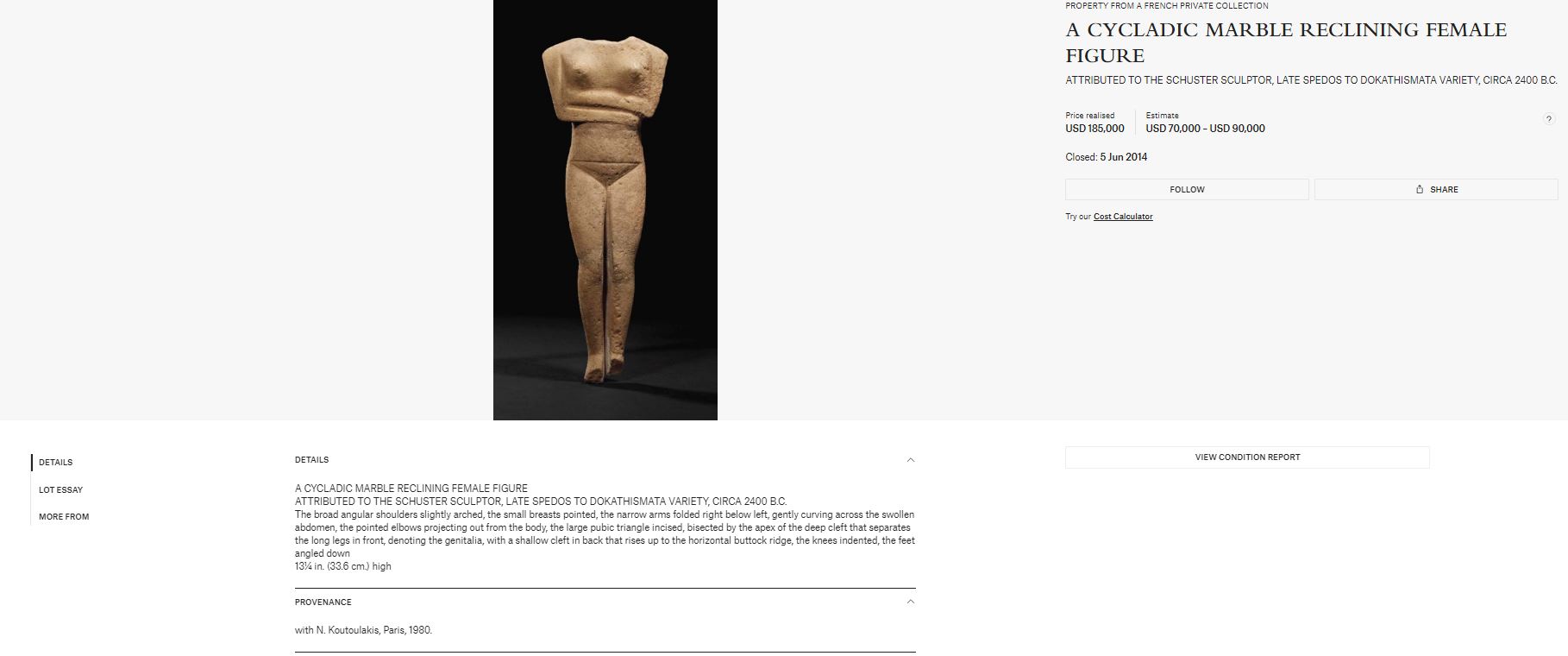 Το NEWS 24/7 φέρνει στο φως το τελευταίο και εξόχως ανησυχητικό εύρημα, είναι το γεγονός πως το γυναικείο κυκλαδικό ειδώλιο με αριθμό 209 στον “κατάλογο” του Στερν βγήκε σε δημοπρασία του οίκου Christie’s στις 5 Ιουνίου 2014. Η αρχική του τιμή ήταν 70.000 και τελικά πουλήθηκε 185.000 δολάρια. Ως προέλευση αναφερόταν “N. Koutoulakis” (Νικολά Κουτουλάκης).