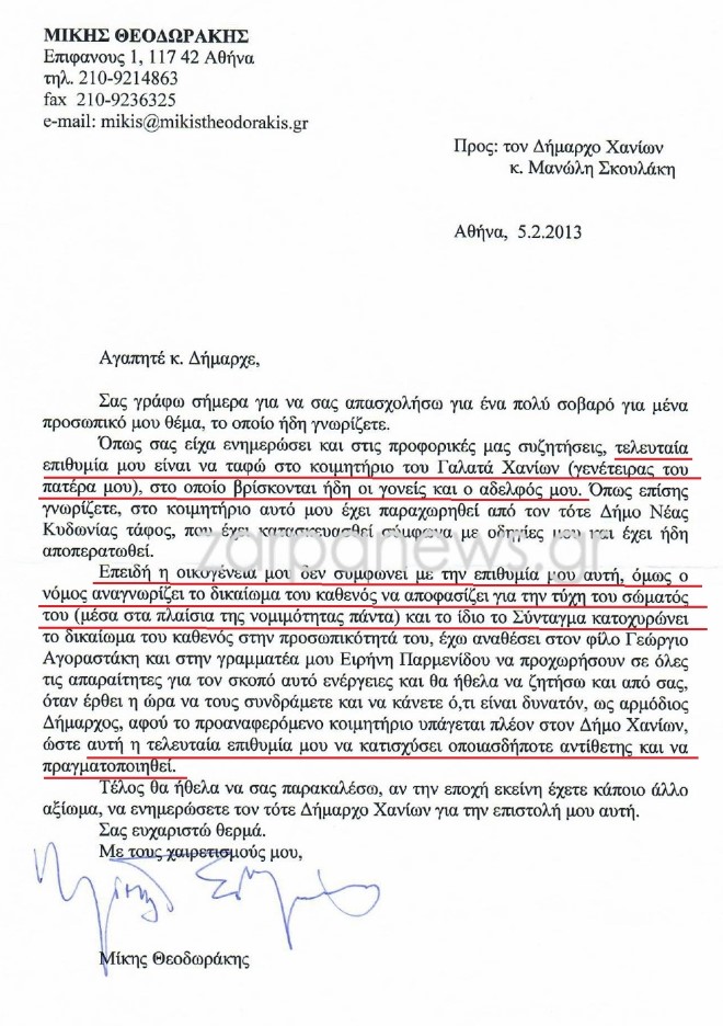 Η επιστολή με την επιθυμία του Μίκη να ταφεί στα Χανιά