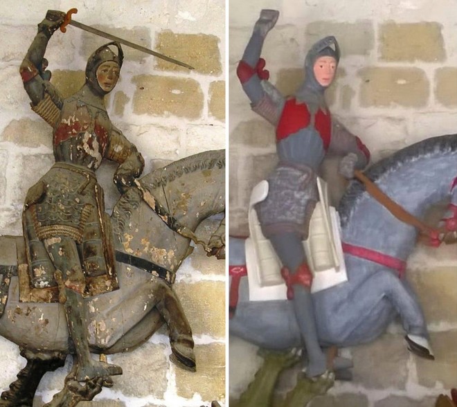 Ένα άλλο χαρακτηριστικό παράδειγμα αποτελεί το ξύλινο άγαλμα του Αγίου Γεωργίου που φιλοτεχνήθηκε τον 16ο αιώνα και φιλοξενείται στην εκκλησία του Σαν Μιγέλ στην Εστέγια της Ισπανίας. Η ομάδα συντηρητών που ανέλαβε την αποκατάστασή του – τα στοιχεία του οποίου δεν έγιναν ποτέ γνωστά – κατάφερε να μετατρέψει τη μορφή του Αγίου σε κάτι που θυμίζει… τον Τεντέν.
