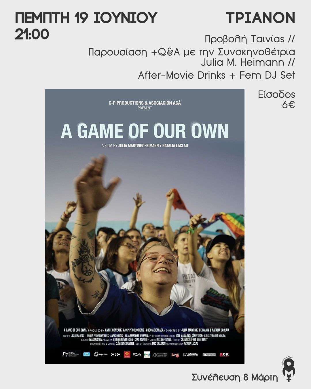 Η Συνέλευση 8 Μάρτη με χαρά καλεί σε μια κινηματογραφική συνάντηση την Πέμπτη 19 Ιουνίου στις 21.00, στον κινηματογράφο Τριανόν (Κοδριγκτώνος 21), για την προβολή της ταινίας A Game of Our Own, από τις αργεντινές σκηνοθέτριες Julia Martinez Heimann και Natalia Laclau.