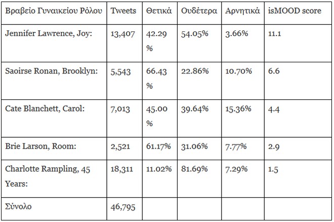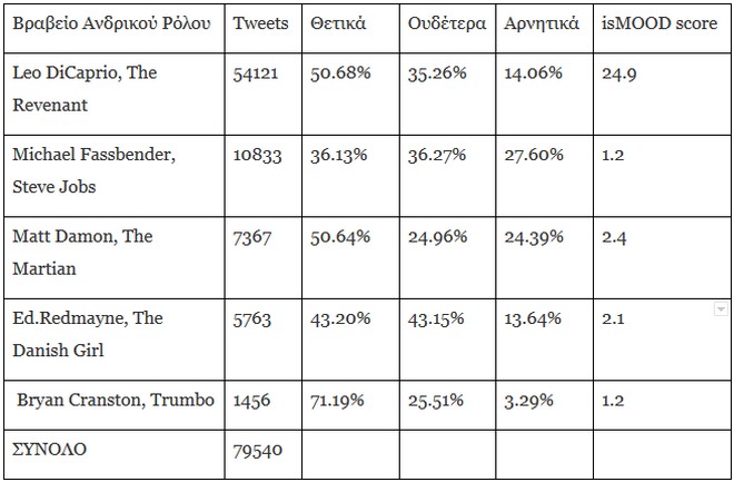 Για να βρούμε τον νικητή, η isMOOD παρήγαγε ένα σύστημα βαθμολογίας, το isMOOD score: Είναι ένας αλγόριθμος που λαμβάνει υπόψη του το «θόρυβο» που προκαλεί ένα γεγονός σε συνδυασμό με το συναίσθημα που εκφράζεται. Δεν μετράει δηλαδή μόνο τον όγκο των αναφορών αλλά καταγράφει και αναλύει τη θετική, αρνητική και ουδέτερη χροιά σε κάθεμια από αυτές. Ψηφίσαμε λοιπόν, τα αποτελέσματα βγήκαν και χωρίς άλλη καθυστέρηση, σας παρουσιάζω τους νικητές: Leonardo Di Caprio και Jennifer Lawrence!