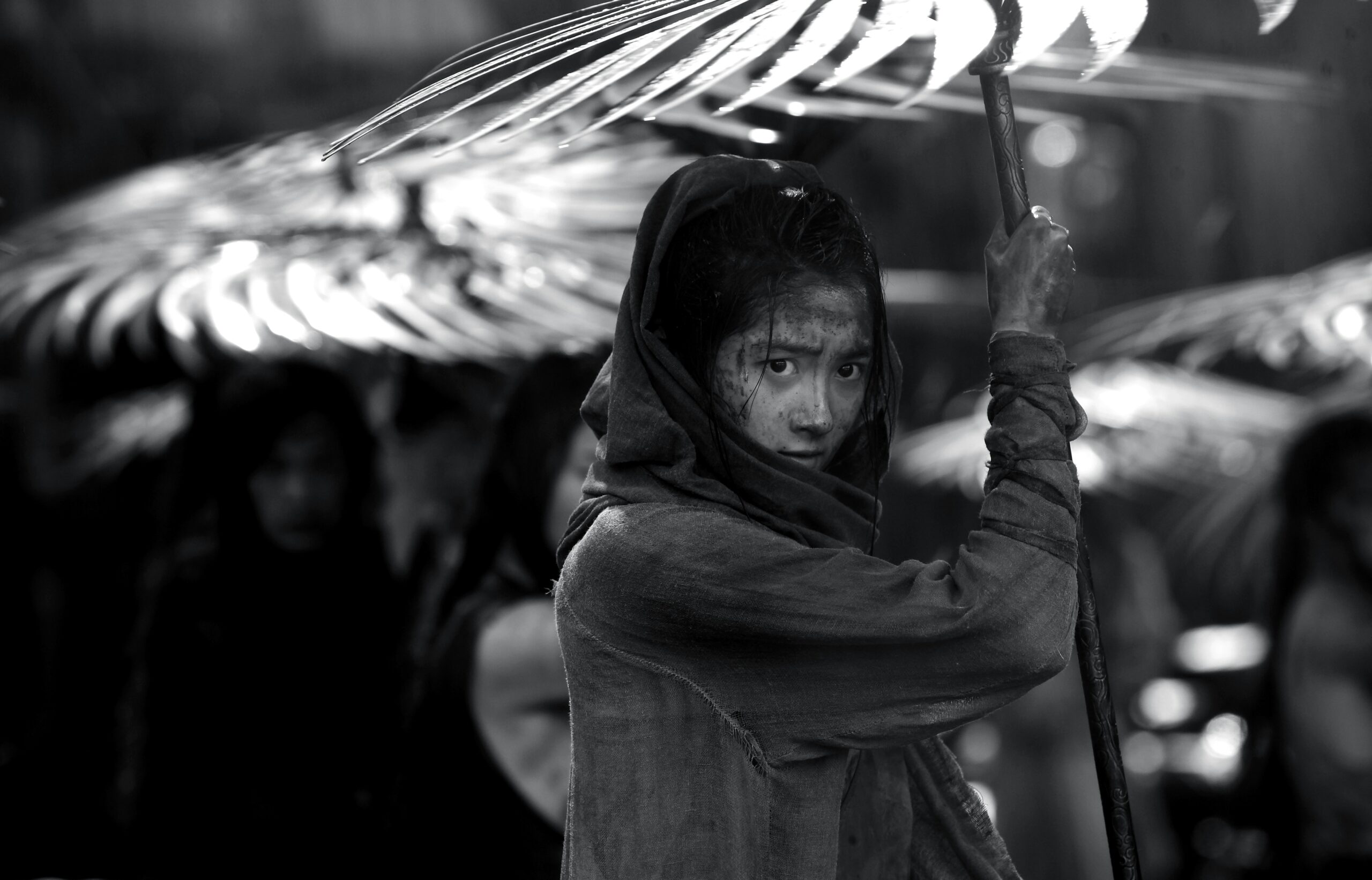 Ξέρουμε ότι σήμερα μπορείς να κάνεις πολλά πράγματα στον υπολογιστή, για παράδειγμα μπορείς να γυρίσεις μια ταινία σε χρώμα και να την μετατρέψεις ψηφιακά σε ασπρόμαυρη. Αλλά δε μου άρεσε αυτό στο μάτι. Οπότε αποφάσισα να χρησιμοποιήσω αληθινά αντικείμενα για να πετύχω αυτή τη χρωματική αποφόρτιση. Εμπνεύστηκα από κινέζικες ζωγραφιές με μελάνι, όπου αναμειγνύοντας μελάνι με νερό δημιουργούνται οι γκρι χροιές. Έτσι, κάθε αντικείμενο στο σετ ήταν βασισμένο σε αυτές τις χροιές. Κάθε υλικό, κάθε όπλο, κάθε ρούχο, ήταν σε αυτή τη χρωματική επιλογή, ήταν μαύρο, λευκό, ή κάποιος συνδυασμός τους.