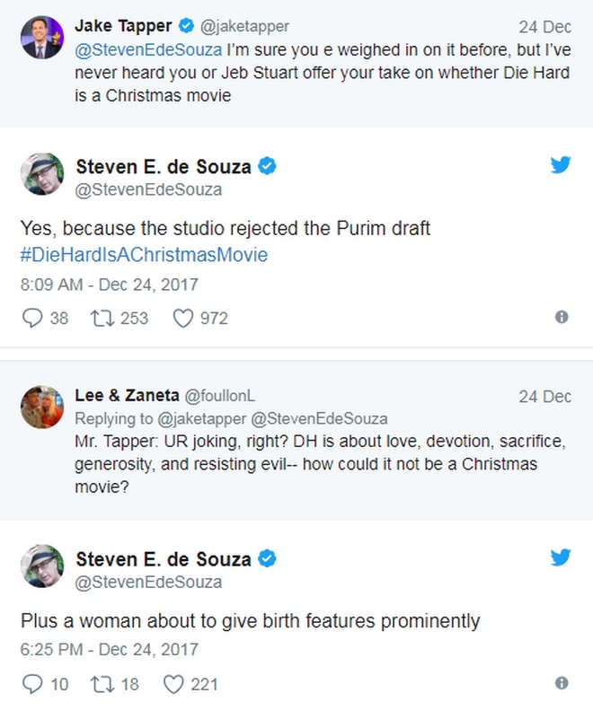 Παραμονή των Χριστουγέννων, ο Στίβεν ντε Σόουζα με ανάρτησή του στο twitter επεσήμανε ότι η πρώτη ταινία της σειράς, του 1988, ενδείκνυται για τις ημέρες που διανύουμε, παρά το γεγονός ότι πρόσφατη δημοσκόπηση του YouGov έδειχνε ότι η πλειονότητα των συμμετεχόντων δεν την θεωρούν κατάλληλη για τις γιορτές.