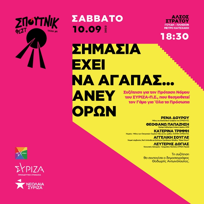 Η ομάδα ΛΟΑΤΚΙ+ ΣΥΡΙΖΑ-Π.Σ. και η Νεολαία ΣΥΡΙΖΑ προσκαλούν όλον τον κόσμο το Σάββατο 10/9/22 στις 18:30 στο Άλσος Στρατού (Γουδή – πλησίον Μετρό Κατεχάκη), στην Αθήνα.