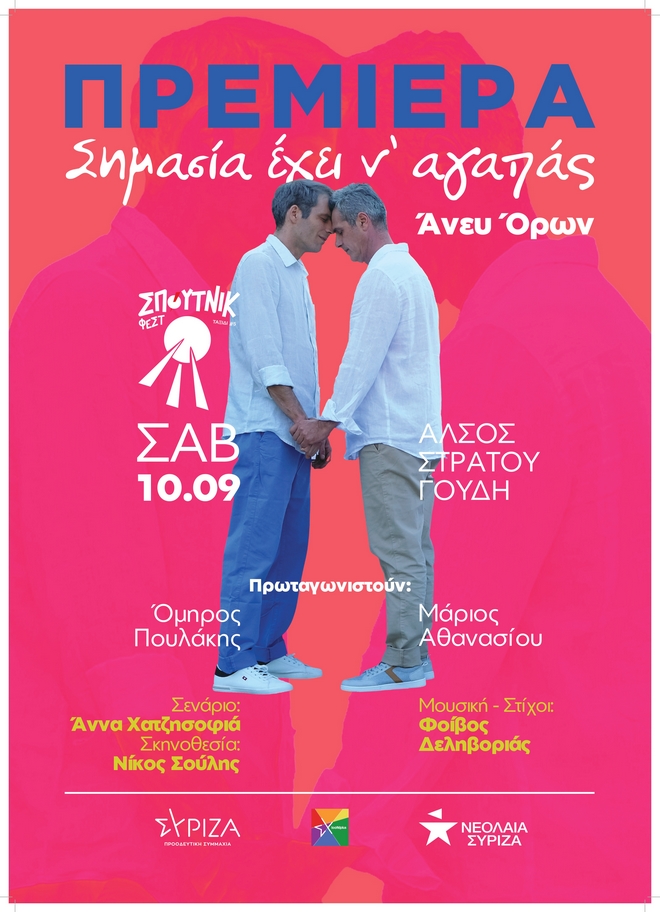 Πρεμιέρα στο Φεστιβάλ Νεολαίας Σπούτνικ το Σάββατο 10/9 για τη μουσική ταινία "Σημασία έχει ν’ αγαπάς… άνευ όρων". Σκοπός της είναι η προώθηση της πρότασης νόμου του ΣΥΡΙΖΑ-ΠΣ για τον Γάμο για Όλα τα Πρόσωπα που κατατέθηκε στη Βουλή στις 17 Ιουνίου.