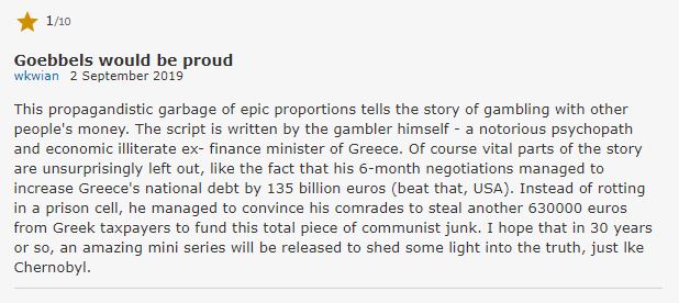 Αρχικά είχαμε τις αρνητικές κριτικές χρηστών της ανοιχτής πλατφόρμας Internet Movie Database (IMDb) και τις κακές βαθμολογίες προς την ταινία, η οποία δεν έχει κάνει ακόμη πρεμιέρα. Οι αρνητικές κριτικές συνοδεύονταν από κακόβουλα και επιθετικά σχόλια εναντίον του βραβευμένου Κώστα Γαβρά και του πρώην υπουργού Οικονομικών και στηλίτευαν την απόφαση του σκηνοθέτη να βασιστεί στις ηχογραφήσεις του Βαρουφάκη, ενώ μιλούσαν για ταινία που έγινε “με λεφτά της πρώην κυβέρνησης”.