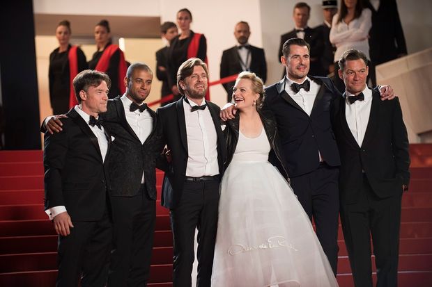 H Elisabeth Moss, ο σκηνοθέτης Ruben Ostlund (αριστερά της) και το καστ της ταινίας ‘The Square’ στην επίσημη πρεμιέρα του στο 70ό Φεστιβάλ Καννών (Arthur Mola/Invision/AP)