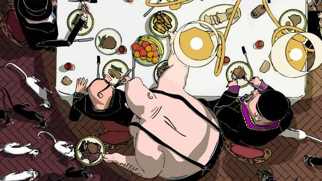 Στη διάρκεια των γεγονότων του 2010, 2011 είχα επικοινωνία με έναν φίλο που ήταν έξω από τη Βουλή με το κίνημα του Occupy Σύνταγμα. Εκεί σκέφτηκα ότι ο κόσμος μπορεί να είναι σαν τις γάτες στις ταβέρνες: Περιμένει να βρει την ευκαιρία να πάρει πίσω ό,τι του ανήκει, ανεξάρτητα από το αν αυτό είναι χρήμα, ελευθερία ή δικαιοσύνη. Σε κάποια στιγμή γίνεται η καταλυτική κίνηση και ο τροχός γυρνάει. Η “Φάρμα των ζώων” ήταν επίσης πηγή έμπνευσης, τα γουρούνια σίγουρα έχουν πάρει την μορφή τους από εκεί. Βέβαια η “Φάρμα” ο Ουέλς μας μιλά για τον ίδιο κύκλο, τα ζώα αντικαθιστούν τον άνθρωπο και εφαρμόζουν ακόμη πιο σκληρούς νόμους. Στο “Dinner For Few” ο άνθρωπος απλά εξυπηρετεί το ζώο μέσα του.