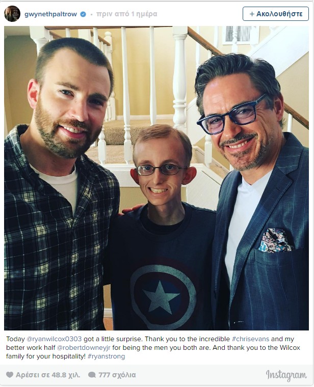 Ηταν πριν λίγο καιρό όταν ο Ρόμπερτ Ντάουνι Τζιούνορ βρέθηκε στην παιδική πτέρυγα του Great Ormond Street Hospital (GOSH) και τώρα μαζί με τον Κρις Εβανς –  όχι σε εμφύλιο πόλεμο, όπως τους θέλει η νέα περιπέτεια του Captain America – έφτασαν στο Σαν Ντιέγκο της Καλιφόρνια για να επισκεφθούν ένα 18χρονο αγόρι που διαγνώσθηκε δεύτερη φορά με λευχαιμία.