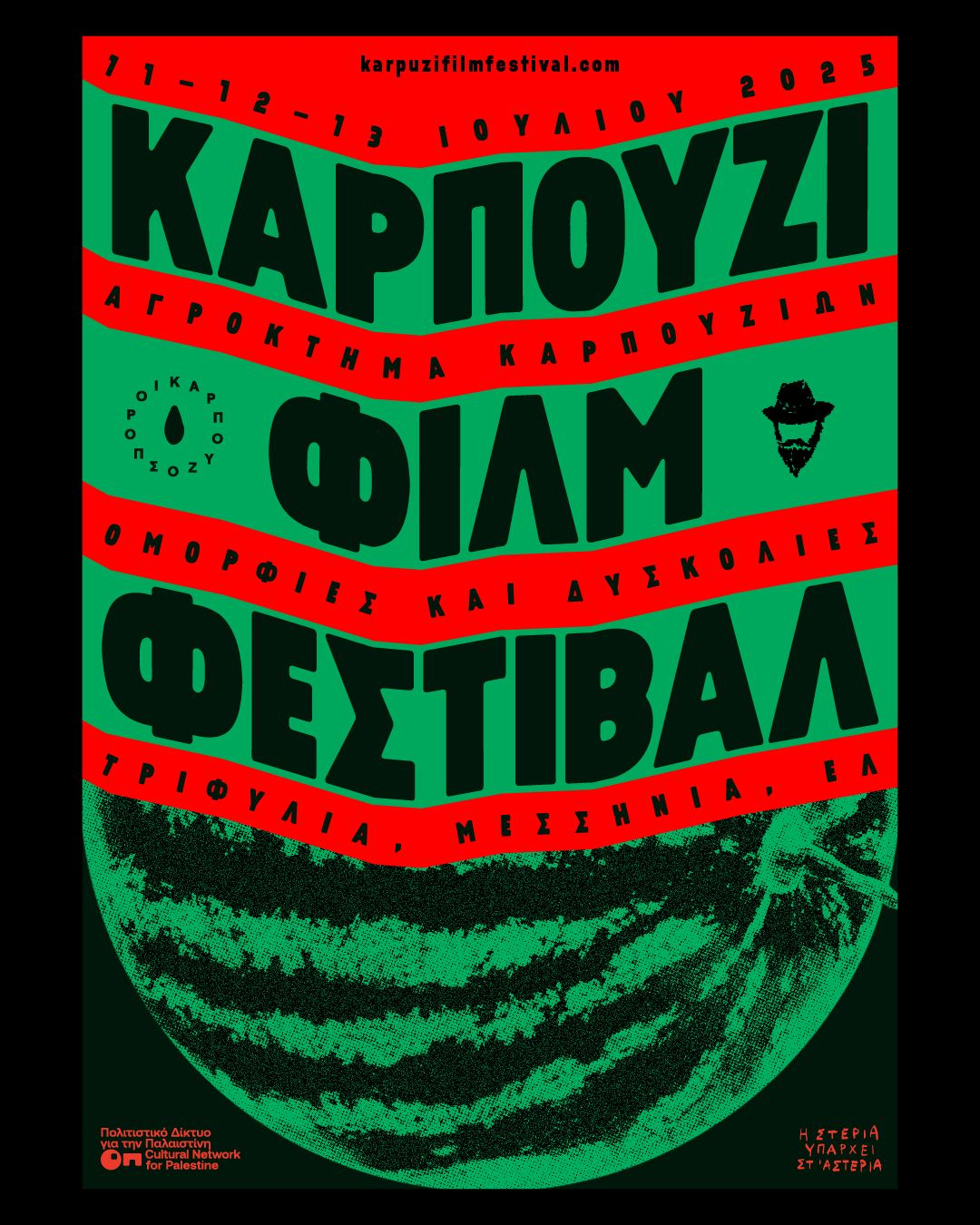 ΚΑΡΠΟΥΖΙ ΦΙΛΜ ΦΕΣΤΙΒΑΛ στο Αγρόκτημα Καρπουζιού ΟΜΟΡΦΙΕΣ ΚΑΙ ΔΥΣΚΟΛΙΕΣ, στην Τριφυλία Μεσσηνίας, ανάμεσα στην Κυπαρισσία και τα Φιλιατρά. Διεξάγεται στις 11, 12, 13 Ιουλίου 2025. Ελεύθερη είσοδος σε όλο το 3μερο. Πληροφορίες | Instagram.