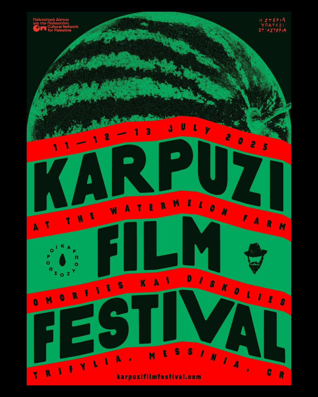 Το Καρπούζι Φιλμ Φέστιβαλ φιλοξενείται από το αγρόκτημα καρπουζιών και τον χώρο τέχνης «Ομορφιές και Δυσκολίες». Έχει επιμεληθεί από την ομάδα ΚΑΡΠΟΥΖΟΣΠΟΡΟΙ με την υποστήριξη του Πολιτιστικού Δικτύου για την Παλαιστίνη. Οι ταινίες “Οι Καταζητούμενες 18” και “Foragers” έχουν παραχωρηθεί γενναιόδωρα από τον Dounias, ενώ οι υπόλοιπες επιλογές έχουν διατεθεί χάρη στην ευγενική υποστήριξη των δημιουργών των ταινιών που συμμετέχουν.