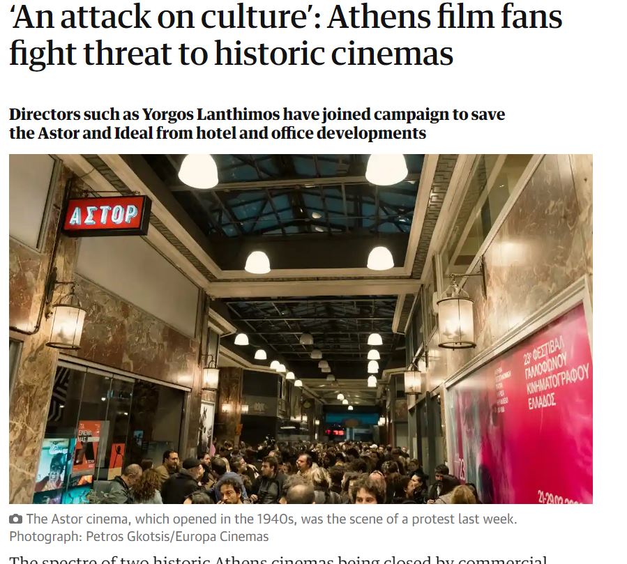 «Το φάσμα του κλεισίματος δύο ιστορικών αθηναϊκών αιθουσών λόγω εμπορικών συμφερόντων αποφασισμένων να τα μετατρέψουν σε ξενοδοχεία και γραφεία, έχει ωθήσει σκηνοθέτες να περάσουν μπροστά στην κάμερα με παρακλήσεις να σταματήσει η διαδικασία», γράφει η βρετανική εφημερίδα.