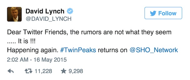 Μέχρι σήμερα, όπου ο Ντέιβιντ Λιντς αποφάσισε πως το «Twin Peaks» δεν θα ήταν τίποτα χωρίς τον ίδιο και με ανακοινωσή του στο Twitter επιβεβαίωσε όχι μόνο πως επιστρέφει στον τρίτο κύκλο της σειράς, αλλά και πως θα τον σκηνοθετήσει μόνος του – και μάλιστα με περισσότερα επεισόδια από τα 9 που αρχικά είχαν προγραμματιστεί.
