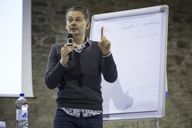 Αμέσως μετά, τη σκυτάλη πήραν οι δύο καλεσμένοι εισηγητές του masterclass. O Franz Rodenkirchen (φωτό), σύμβουλος συγγραφής σεναρίου και εκπαιδευτής στο TFL, παρουσίασε τις ιδιαιτερότητες της ανάπτυξης ενός σεναρίου σε σχέση με την αξιολόγησή του.