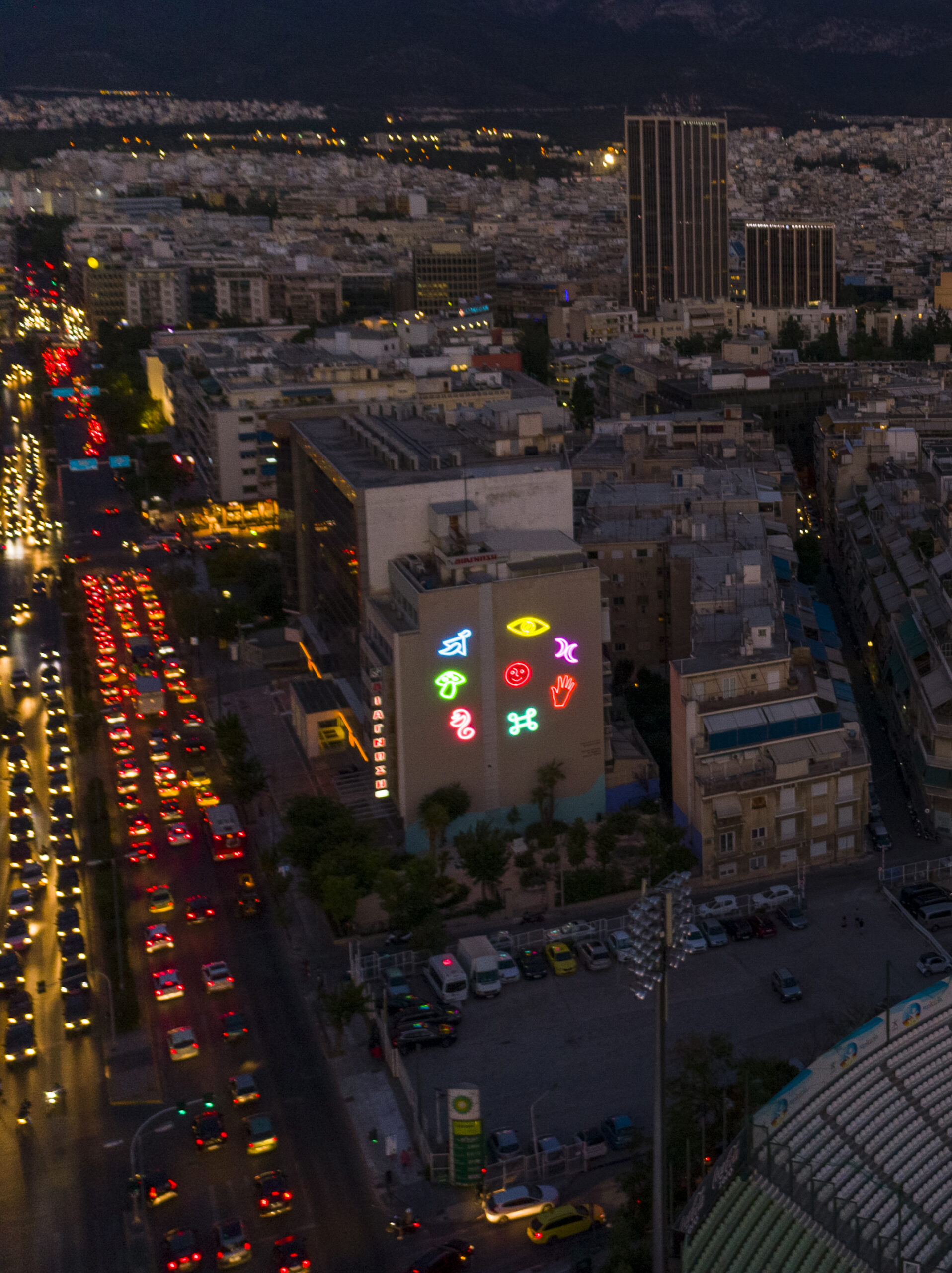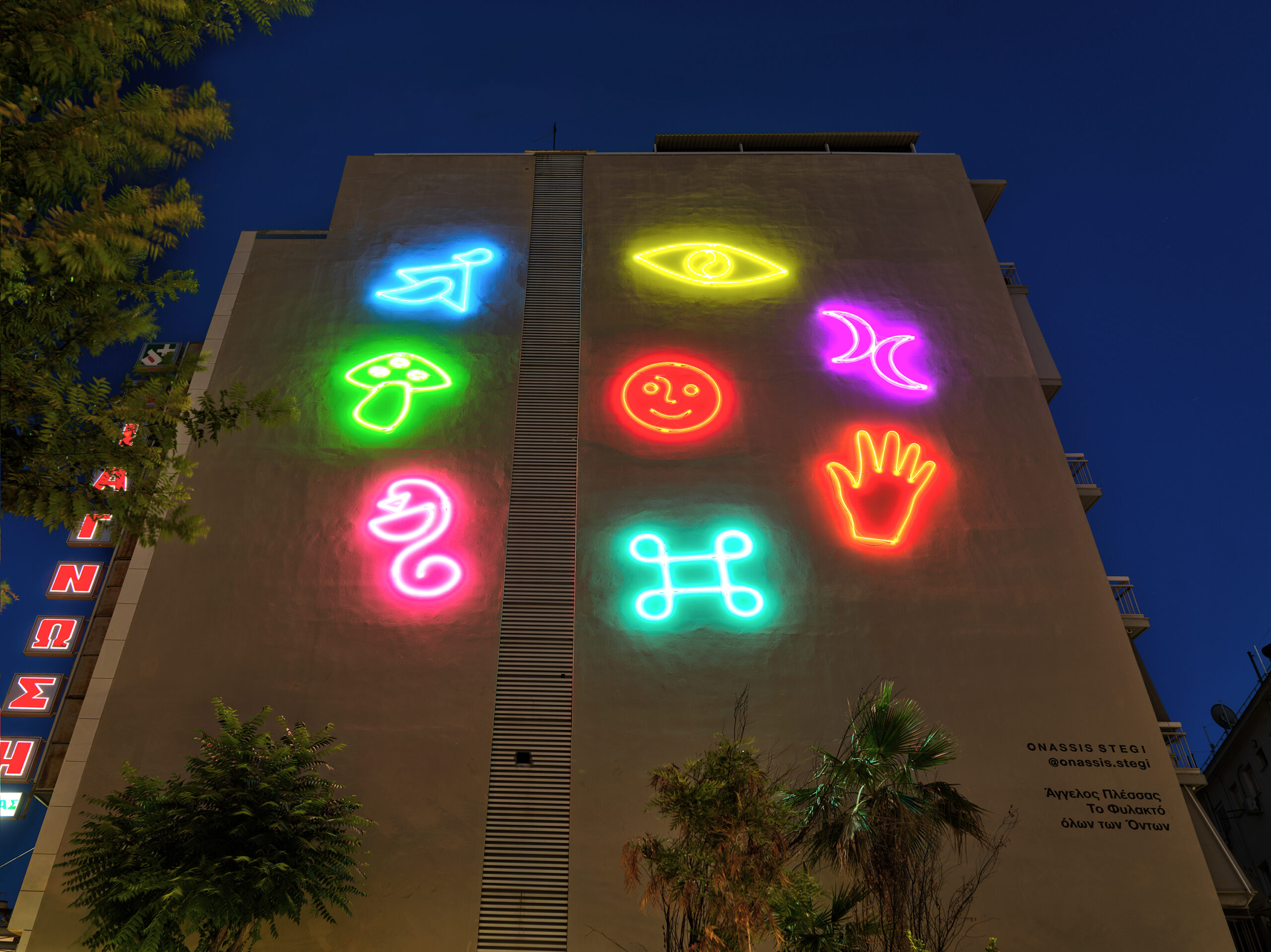 Μια νέα τοιχογραφία-φυλαχτό για όλους μας είναι τοποθετημένη στη Λεωφόρο Αλεξάνδρας, απέναντι από το αντικαρκινικό νοσοκομείο «Άγιος Σάββας». Πρόκειται για μία in situ εγκατάσταση από neon -που έγινε με τη συνδρομη της Στέγης- που αποτελείται από μια κόκκινη χαμογελαστή φατσούλα (emoji), η οποία περιβάλλεται από επτά σύμβολα σε κυκλική διάταξη και για κάποιο περίεργο λόγο κοιτώντας την αισθάνεσαι μία ψυχική ανάταση.