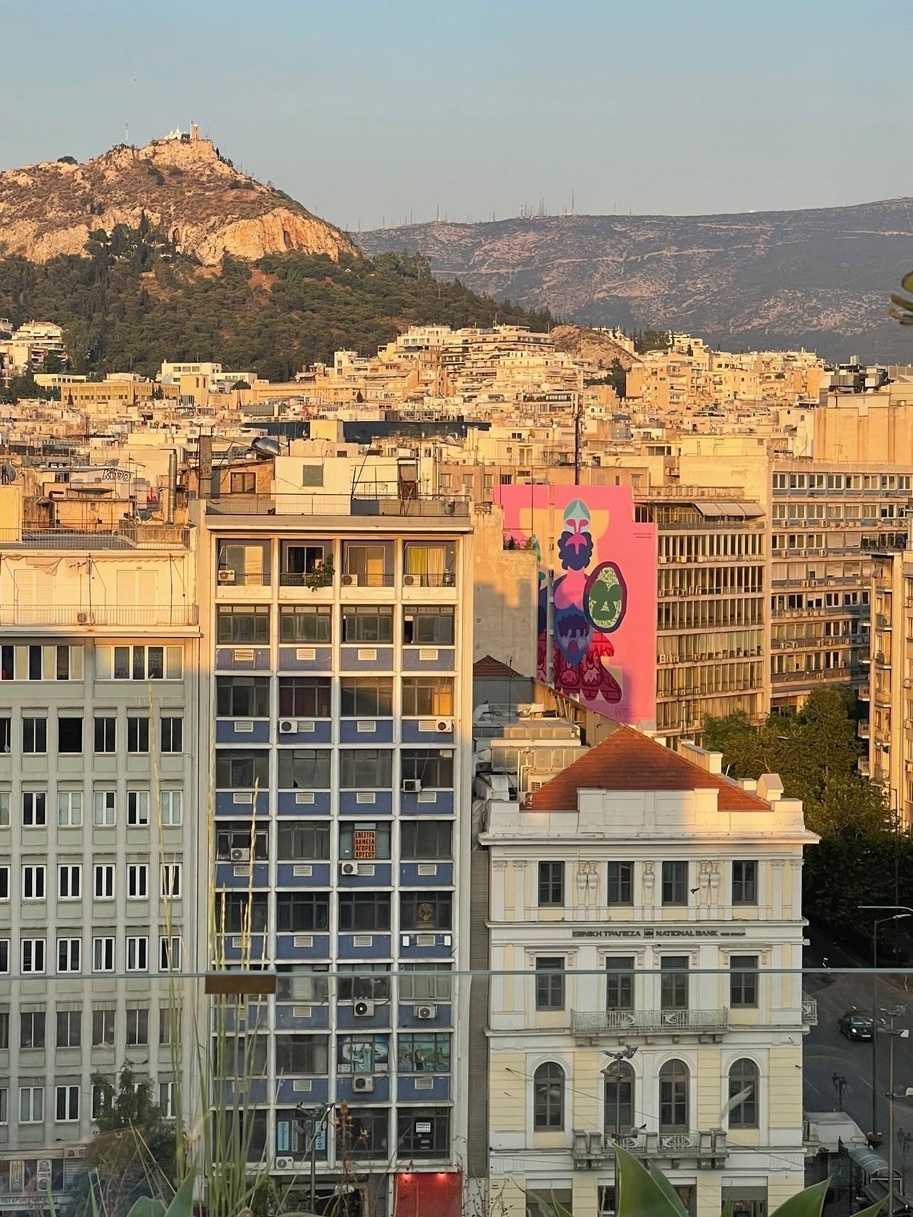 Ένα νέο mural έκανε τις τελευταίες ημέρες την εμφάνισή του, εκεί που η οδός Πανεπιστημίου στρίβει και “ανοίγεται” στην πλατεία Ομονοίας και στο επιβλητικό πια συντριβάνι της. Σε μία ψηλή μεσοτοιχία που όταν την κοιτούσες από την πλατεία ένιωθες πως σε “πλάκωνε”, ορθώθηκε τώρα μία αλλιώτικη θεά Αθηνά σε ροζ φόντο. Μία Αθηνά πολύχρωμη, σαν παιδική ζωγραφιά που κρατά δόρυ και ασπίδα και στέκεται σαν φρουρός.