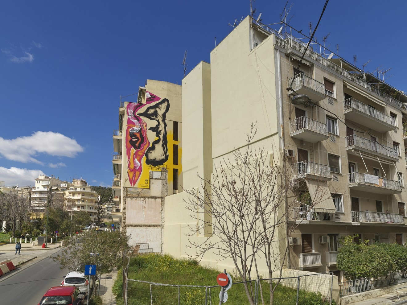 Η τοιχογραφία καταλαμβάνει την πλαϊνή όψη μιας πενταόροφης πολυκατοικίας που βρίσκεται στην οδό Δορυλαίου 18, πλησίον της πλατείας Μαβίλη. Στο πάνω μέρος ενός μακρόστενου, ακάθαρτου τοίχου, ο οποίος φέρει τα ίχνη μιας γκρεμισμένης κατοικίας, οι διερχόμενοι που ανεβαίνουν προς τον Λόφο του Λυκαβηττού σηκώνουν το κεφάλι για να αντικρίσουν, με φόντο τον αττικό ουρανό, μια ονειρική σύνθεση με κυματοειδείς μορφές ύψους 13 μέτρων.