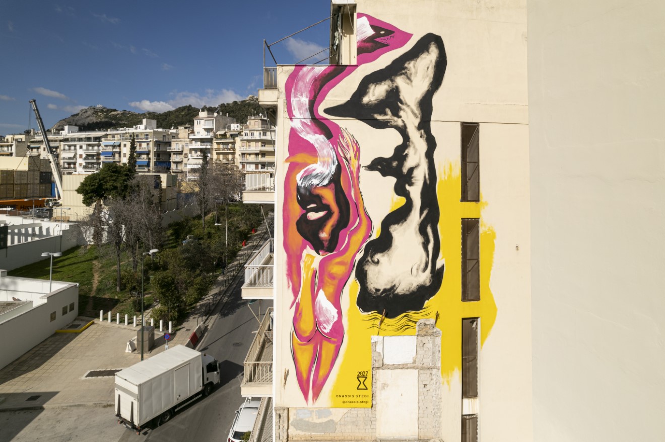 Ο πολιτισμός βγαίνει και πάλι από τη Στέγη και διατρέχει την πόλη. Κατεβαίνει στο κέντρο της Αθήνας, βάζει χρώμα στους τοίχους της, και υπερασπίζεται το αστικό τοπίο ως κάτι διαχρονικό. Η Αθήνα είναι η πόλη μας και την αντιμετωπίζουμε σαν αυτό που είναι: Έναν ζωντανό οργανισμό γεμάτο ενδιαφέρουσες συναντήσεις, γεμάτο ανθρώπους που με τη δουλειά τους αλλάζουν δρόμους ή γειτονιές, καθένας με τον τρόπο του – μια περιοχή που εξελίσσεται διαρκώς, ανανεώνεται και αναζητά απαντήσεις σε διαχρονικά ερωτήματα. Και γι’ αυτό, την εξερευνούμε καθημερινά. Κάθε χρόνο, μέσα από αναθέσεις και επιτόπιες καλλιτεχνικές παρεμβάσεις στον δημόσιο χώρο του κέντρου της Αθήνας, η Στέγη του Ιδρύματος Ωνάση αναζητά μέρη στα οποία η τέχνη μπλέκεται με τη καθημερινότητα. Μέσα από μια σειρά έργων που διαπερνούν τις πολυκατοικίες, σπουδαία έργα σύγχρονων Ελλήνων εικαστικών αναγεννιούνται σε μεγάλη κλίμακα. Μετά το «Φιλί» του Ηλία Παπαηλιάκη στην πλατεία Αυδή στο Μεταξουργείο, η Στέγη παρουσιάζει το «Κύμα / Νεύμα» της Σοφίας Στεβή στην πλατεία Μαβίλη. Και θα υπάρξει συνέχεια.