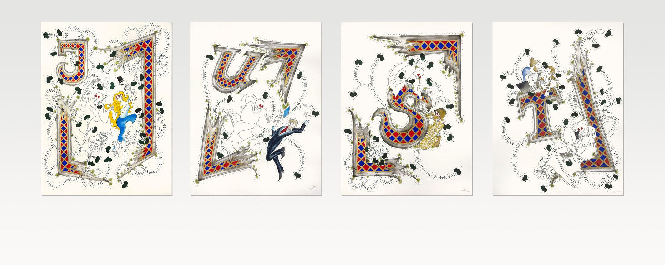Συναφής με τη δημοσιογραφική φωτογραφία, η σειρά “JUST STOP NOW!” μοιάζει με κραυγή απελπισίας όπως αυτές που συνήθως συναντά κανείς στα μέσα κοινωνικής δικτύωσης, αλλά υιοθετεί μια μεσαιωνική προσέγγιση στις σύγχρονες συγκρούσεις. Βασισμένα σε μια αργή και στοχαστική σχεδιαστική διαδικασία, τα έργα αναφέρονται στον πόλεμο και τη βία που συναντάμε σε πολλά μέρη του κόσμου. Τα γράμματα που συνθέτουν το σύνθημα μάς θυμίζουν εικονογράφηση βιβλίων και παραπέμπουν σε μια μακρά ιστορία βίας. Πρόκειται για μια έκκληση ανθρωπιάς που αποφεύγει προσεκτικά να λάβει τη μια ή την άλλη θέση ενώ ξαναμαγεύει απροσδόκητα τη σύγχρονη κοινωνία μας.