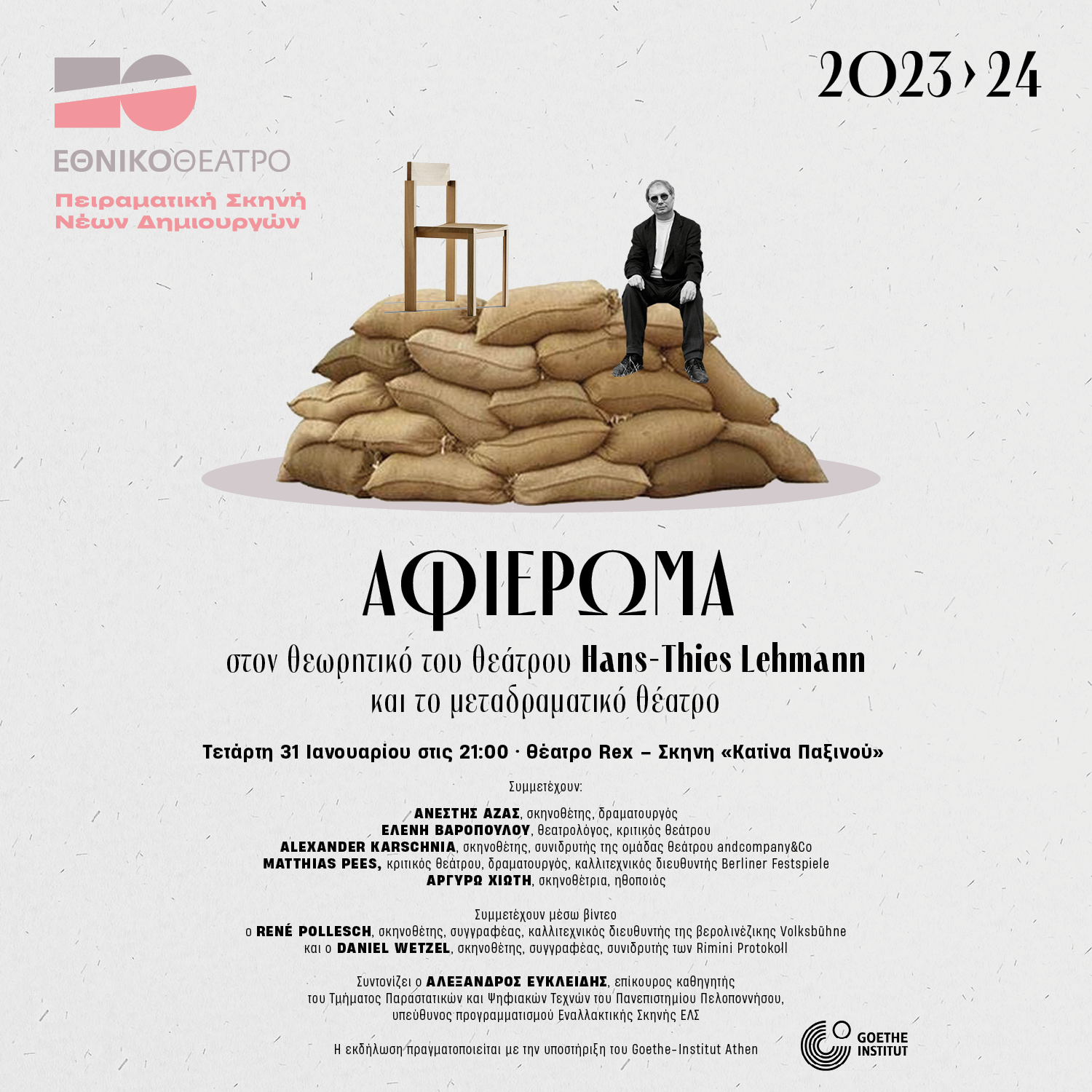 Στην Πειραματική Σκηνή Νέων Δημιουργών στο πλαίσιο του κύκλου εκδηλώσεων “Ιστορίες που δεν ακούγονται” θα παρακολουθήσουμε ένα αφιέρωμα στον θεωρητικό του θεάτρου Hans-Thies Lehmann και το μεταδραματικό θέατρο. Η είσοδος στην εκδήλωση είναι δωρεάν και θα δοθούν δελτία εισόδου με σειρά προτεραιότητας από τα ταμεία του θεάτρου.