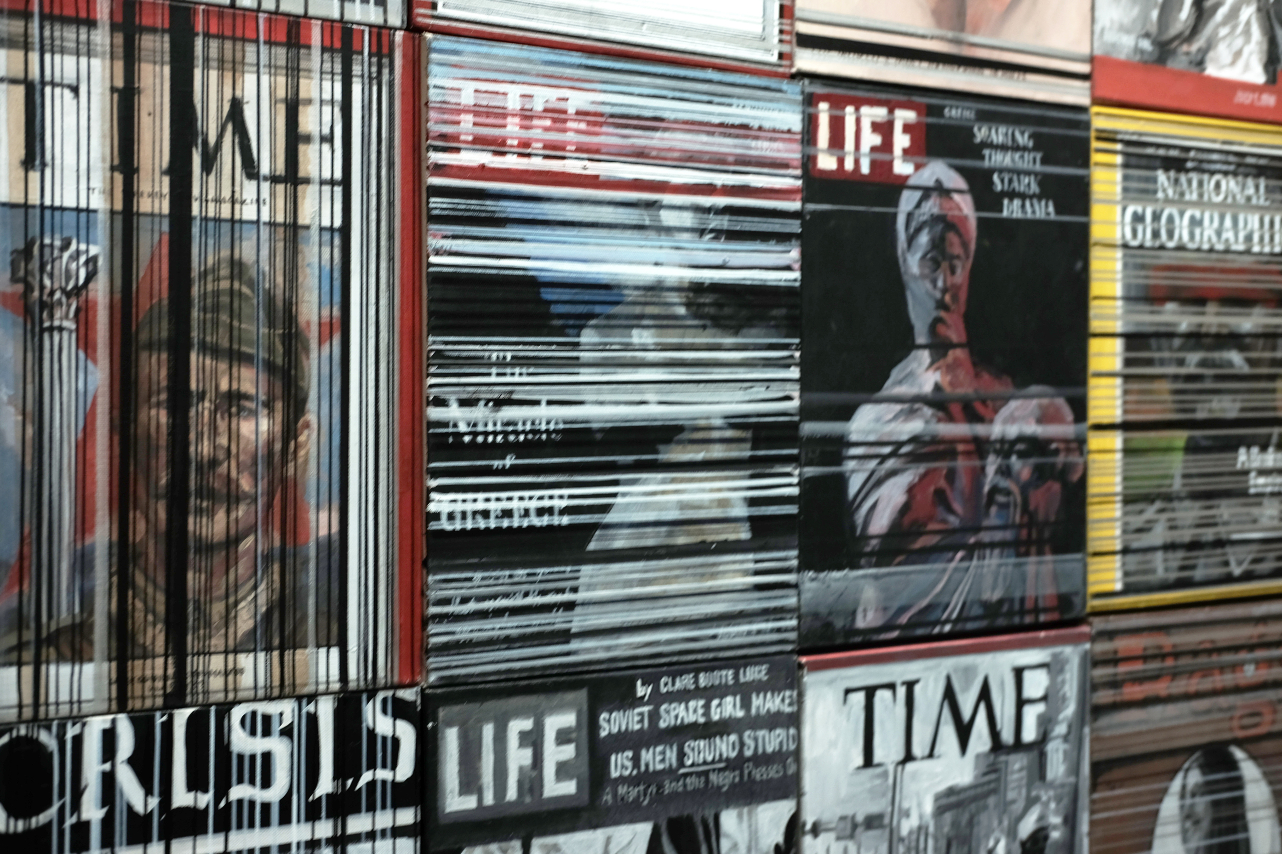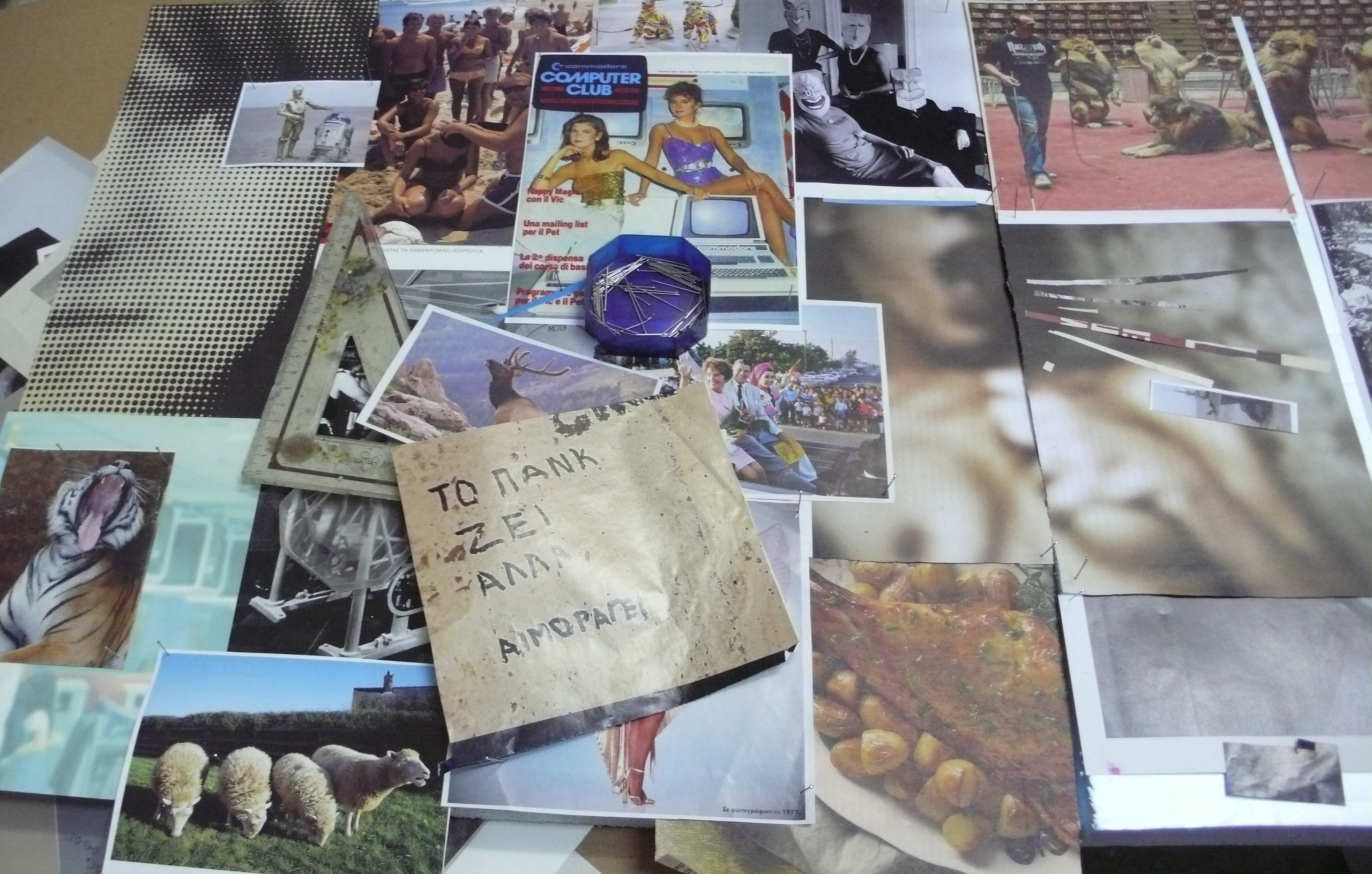 Παράλληλα, ο καλλιτέχνης εκθέτει, σε οιονεί αποθετήριο, πακτωμένα με μαύρες μονωτικές ταινίες περιοδικά, όπου εκτυλίσσονται από τη μεριά των ΜΜΕ σωροί καταλυτικών γεγονότων αλλά και καθημερινών στιγμιοτύπων. Παρατάσσει, συνάμα, βιβλία κατασκευασμένα από τον ίδιο με τη μέθοδο των επικολλήσεων, αλλά και με τις ιστορικές μεθόδους détournement / εκτροπή-οικειοποίηση, που εισήγαγε στη δεκαετία του 1950 ο Guy Debord και cut-up/ τεμαχισμός-ανασυγκόλληση, που επινόησαν από κοινού οι William S. Burroughs & Brion Gysin στη δεκαετία του 1960. Επίσης, ανασυνθέτει εξώφυλλα εμβληματικών εντύπων του 20ού αιώνα.