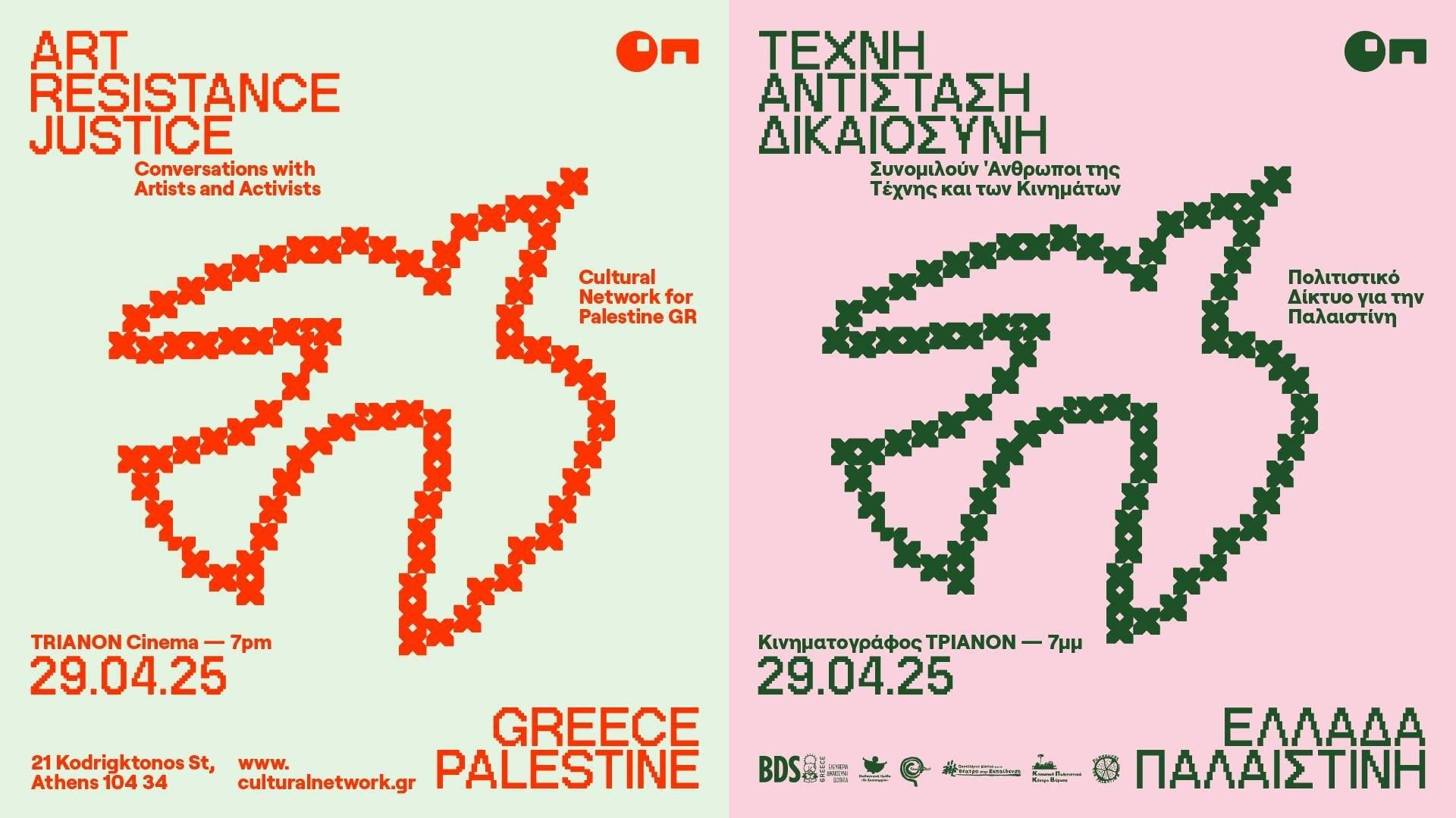 Η εκδήλωση θα πραγματοποιηθεί την Τρίτη 29 Απριλίου, ώρα 7μμ στον κινηματογράφο ΤΡΙΑΝΟΝ με τίτλο: Τέχνη – Αντίσταση – Δικαιοσύνη: Ελλάδα – Παλαιστίνη / Κάνοντας το αίτημα για δικαιοσύνη πράξη μέσα από την τέχνη