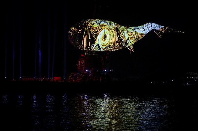 Η επιβλητική εκδήλωση της Τελετής στην θάλασσα, σε σκηνοθεσία του Βρετανού Κρις Μπόλντουιν, έδωσε με τρόπο εντυπωσιακό, στίγμα ιστορίας και παράδοσης με πρωταγωνιστές τα καράβια και τους κατοίκους της ναυτικής πόλης, προεκτάσεις μυθολογίας του Κάτω και Πάνω κόσμου με την εναλλαγή σκότους/φωτός από δέσμες φωτός των προβολέων στον ουρανό, υπό τους ήχους της χορωδίας της Μαρίνας Σάττι “Chores”.
