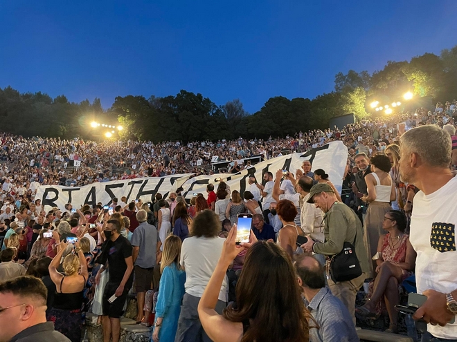 Πιο συγκεκριμένα, λίγο πριν την έναρξη της παράστασης “Πέρσες” σε σκηνοθεσία Δημήτρη Καραντζά στο θέατρο της Επιδαύρου, στο πλαίσιο του Φεστιβάλ Αθηνών και Επιδαύρου, θεατές σήκωσαν πανό με σύνθημα “Βιαστής είναι”.