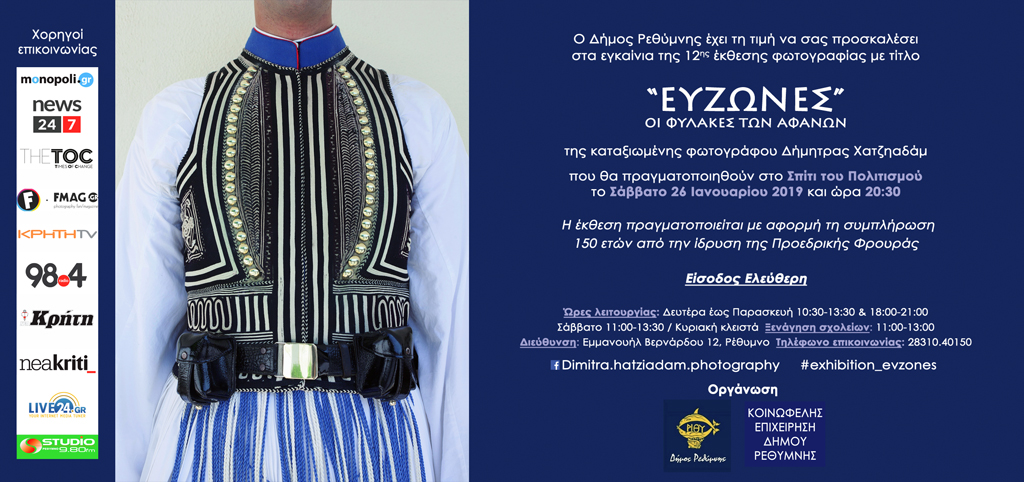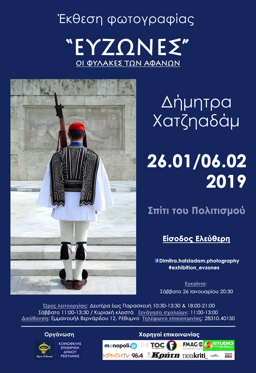 Συνεχίζοντας την πορεία της στην Ελληνική επικράτεια, η έκθεση φωτογραφίας της Δήμητρας Χατζηαδάμ με θέμα “ΕΥΖΩΝΕΣ/Οι φύλακες των αφανών” παρουσιάζεται στον Δήμο Ρεθύμνης. Η έκθεση που συνδιοργανώνεται με την Κ.Ε.ΔΗ.Ρ. του Δήμου Ρεθύμνης, γίνεται με αφορμή τη συμπλήρωση 150 ετών από την ίδρυση της Προεδρικής Φρουράς και θα παρουσιαστεί στο Σπίτι του Πολιτισμού, από 26.01 έως 06.02.2019.