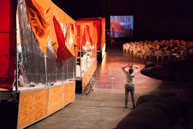 Μια καυστική, αστεία παράσταση που θέτει σημαντικά φιλοσοφικά ερωτήματα γύρω από την πολιτική, τον χρόνο, τον χώρο, την πραγματικότητα και την πρόοδο, και θα διαδραματίζεται στα φορτηγά του «Rollende Road Show» της Φόλκσμπύνε.