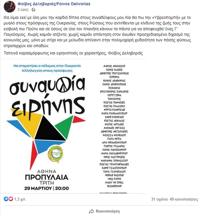 Με ανάρτησή του ο Φοίβος Δεληβοριάς επιβεβαίωσε ότι θα δώσει το παρών στη Συναυλία Ειρήνης που θα πραγματοποιηθεί την Τρίτη 29 Μαρτίου στα Προπύλαια “με όλη του την καρδιά δίπλα στους συναδέλφους του”.