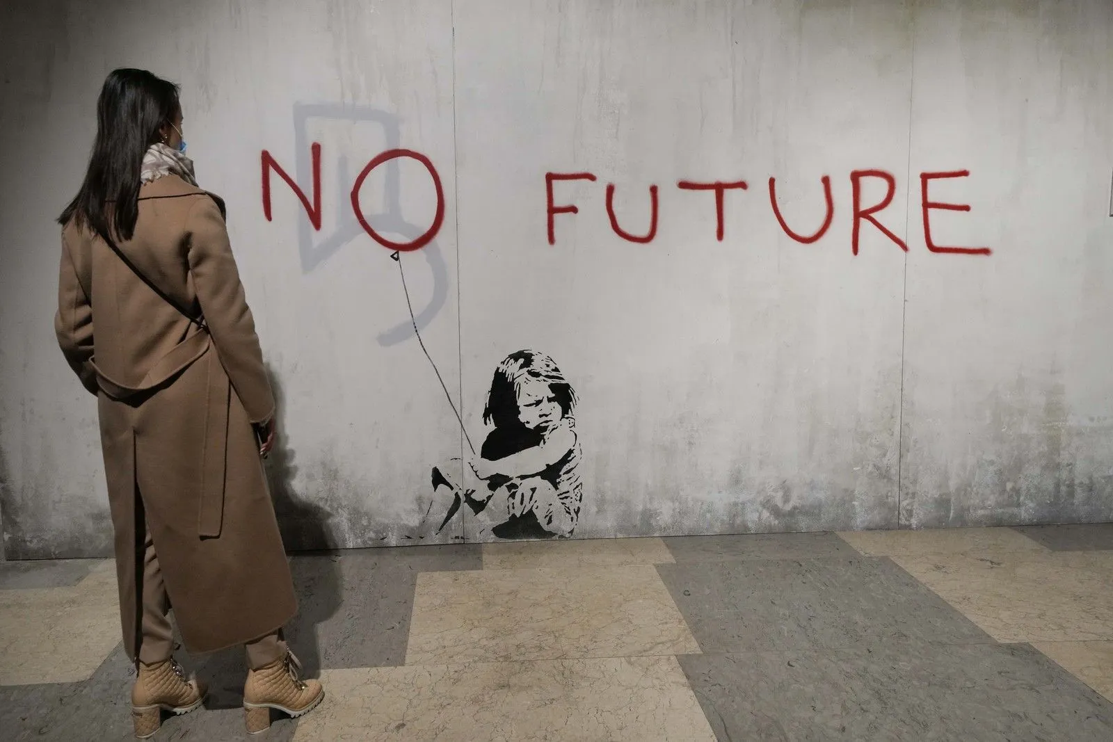 "Girl with Balloon", μια αναπαραγωγή ενός τοιχογραφικού έργου του Βρετανού καλλιτέχνη Banksy, κατά την αποκάλυψη της έκθεσης "The World of Banksy". AP Photo