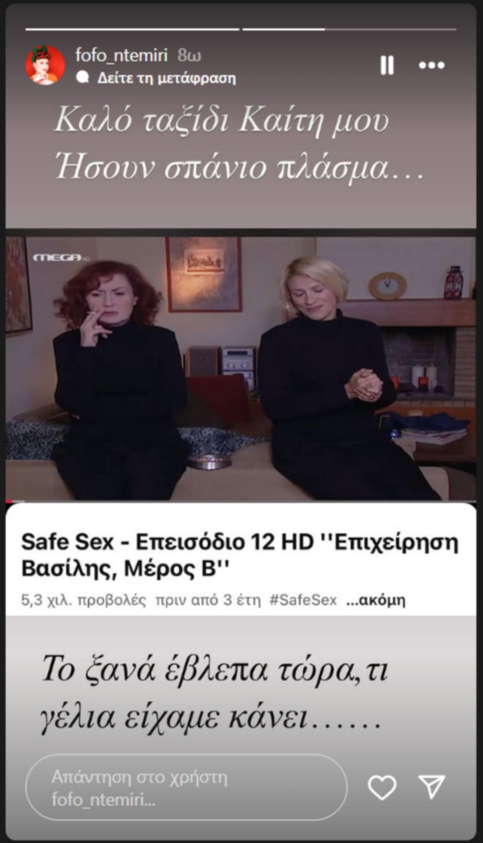 Η Φωτεινή Ντεμίρη αποχαιρέτησε την Καίτη Κωνσταντίνου με μια σκηνή από το “Safe Sex”.