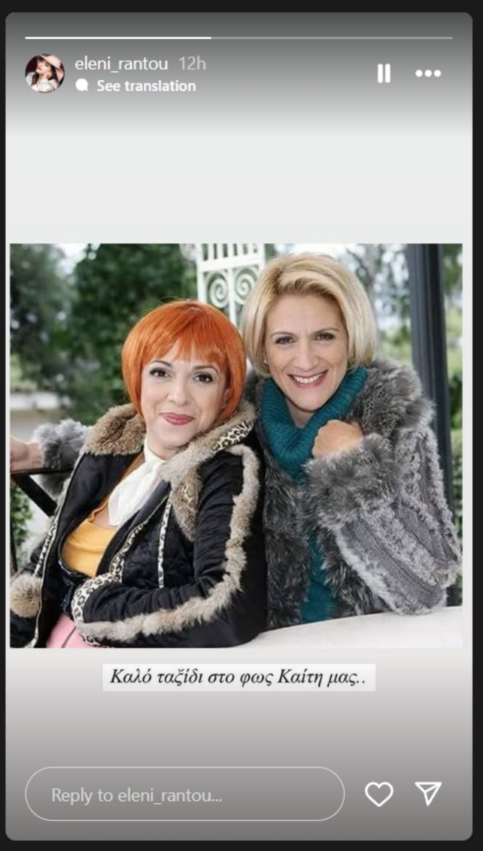 “Καίτη μου αγαπημένη θα είσαι πάντα στις καρδιές μας στην καλύτερη θέση γιατί ήσουν όχι μόνο εξαιρετική ηθοποιός και συνεργάτης αλλά και ένα πλάσμα σπάνιο με αξιοπρέπεια, ήθος, σεβασμό με πολύ αγάπη για τους ανθρώπους!!! Σαν να το ένιωσα φέτος και ντύθηκα ΣΩΣΩ σε πήρα από το στούντιο βαμμένος ντυμένος με είδες χάρηκες γιατί είχες πολύ χιούμορ και γελάσαμε πάρα, πολύ μου είπες θα έρθεις να με δεις σε περίμενα με πολύ χαρά μέχρι χθες που μάτωσε η ψυχή μου!!! Καλό ταξίδι καρδιά μου σ ευχαριστώ για όλα όσα μοιραστήκαμε όσα είπαμε και όσα δεν είπαμε!!! Θα μας λείψεις!!!”.