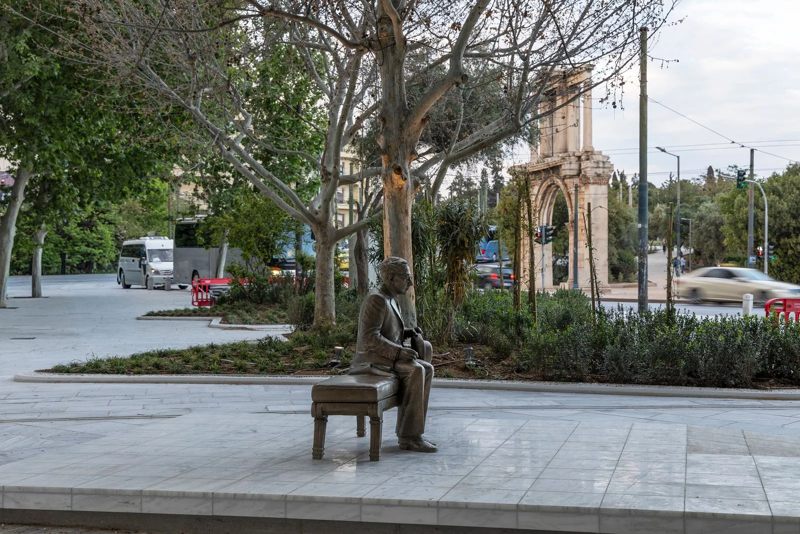 Ο Κωνσταντίνος Καβάφης κάθεται σε ένα παγκάκι στη Διονυσίου Αρεοπαγίτου, κοιτάζοντας «ελαφρώς λοξά προς το σύμπαν». Η Πύλη του Αδριανού μαγνητίζει το βλέμμα, κι εκείνος μοιάζει να αφουγκράζεται τη ροή και την ιστορία της πόλης. Για μια στιγμή νιώθεις πως, αν καθίσεις δίπλα του, θα σου μιλήσει χαμηλόφωνα ή απλώς θα μείνει εκεί, σταθερός, διαθέσιμος να σε ακούσει.