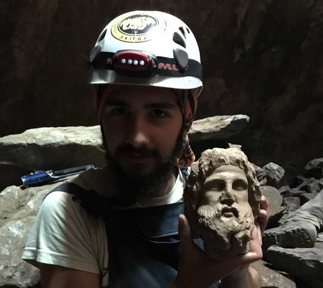 Κεφαλή γενειοφόρου μορφής κατά την εύρεσή του εντός της δεξαμενής (πιθανότατα Ασκληπιός, ή ενδεχομένως Σάραπις)