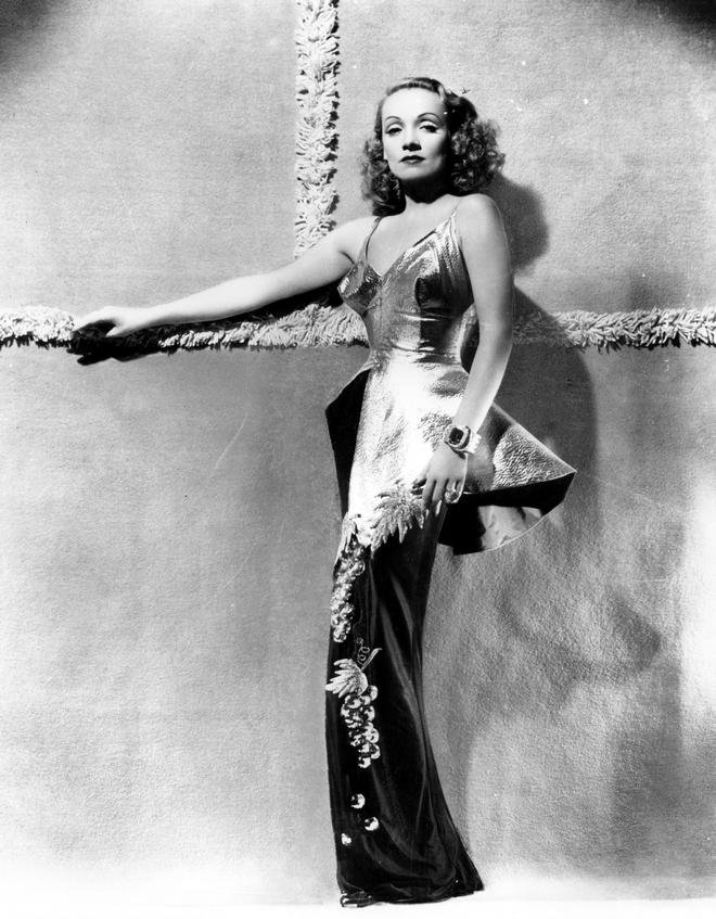 This is a 1940 photo of actress and entertainer Marlene Dietrich wearing a gold lame and black silk taffeta wardrobe in Hollywood, Calif. (AP Photo) AP Photo
